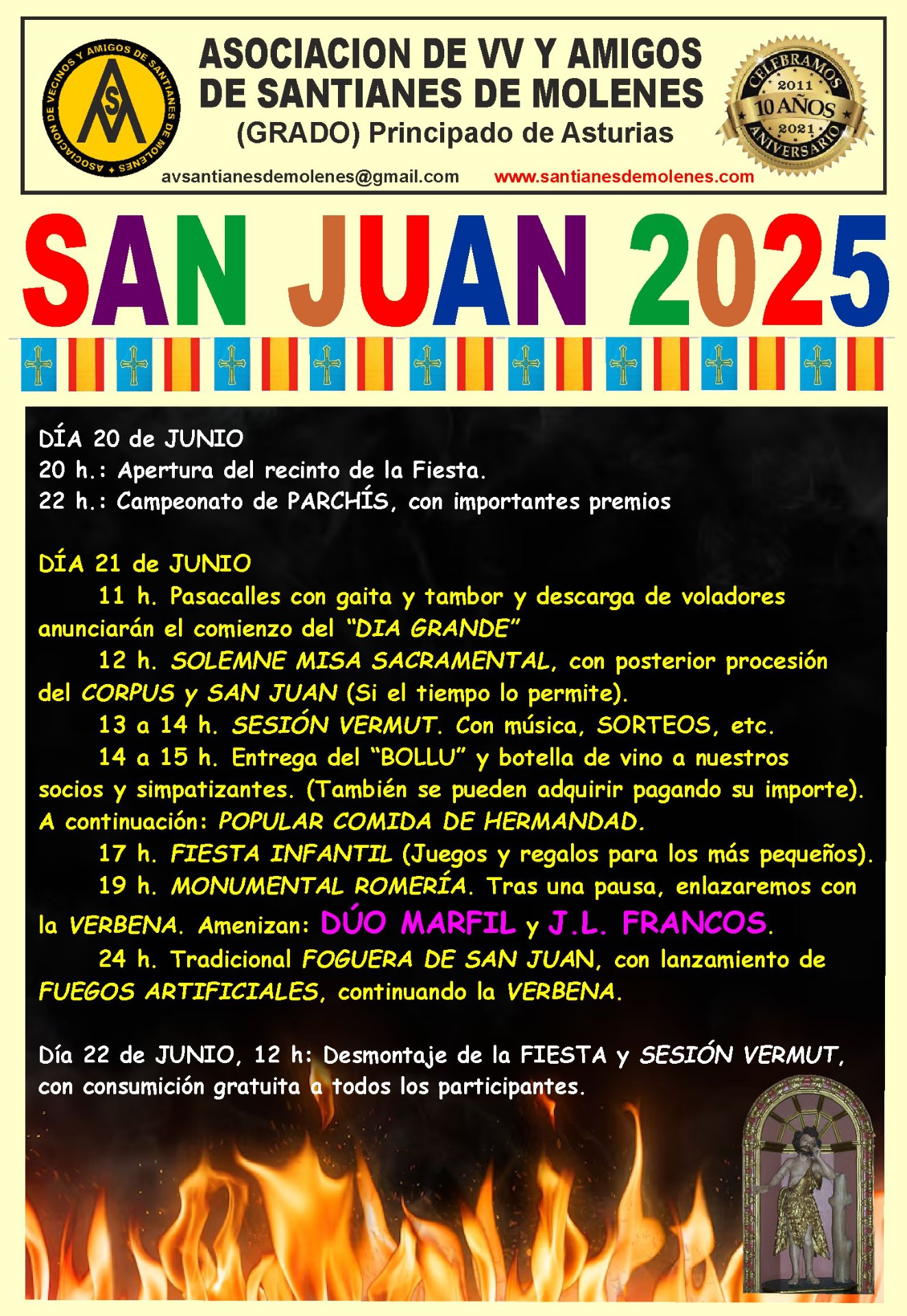El día 25 de Junio celebramos el Día Grande de San Juan, con gran afluencia de gente a pesar de que la climatología no nos fue muy favorable (Los festejos ya habían empezado la noche anterior, con la apertura del recinto y el campeonato de parchís). Un cielo gris con amenaza de lluvia nos acompañó toda la jornada y un ligero "orbayu" hizo acto de presencia en algunos momentos. Todo esto no quitó esplendor a la Fiesta, la cual se desarrolló según el programa previsto: Pasacalles, con gaita y tambor por todo el pueblo de Santianes, anunciaron el comienzo del festejo. A las doce: Misa Sacramental y posterior procesión con El Santísimo bajo palio y la imagen de San Juan, acompañados por el grupo de gaiteros, que fue seguida con gran fervor y devoción por todos los asistentes. A continuación tuvo lugar la entrega del "Bollu" a los socios y simpatizantes y rifa de un jamón a cargo del campechano y jovial FALO ESTRADA, acompañados por el simpático grupo de gaitas que con su música amenizaron todos estos actos. Después de la COMIDA DE HERMANDAD bajo la carpa, (que afortunadamente ya se nos queda pequeña), tuvo lugar nuestro primer concurso de CINTAS A CABALLO, en el que siete intrépidos jinetes compitieron para conseguir el mayor número de cintas y con ello llevarse el GRAN PREMIO SANTIANES DE MOLENES, aunque hubo recompensa para todos, pues todos se llevaron un trofeo. Ya avanzada la tarde comenzó la Romería y posterior Verbena. A las 12 de la noche tuvo lugar la tradicional Foguera, con lanzamiento de fuegos artificiales que fueron del agrado de los allí presentes.